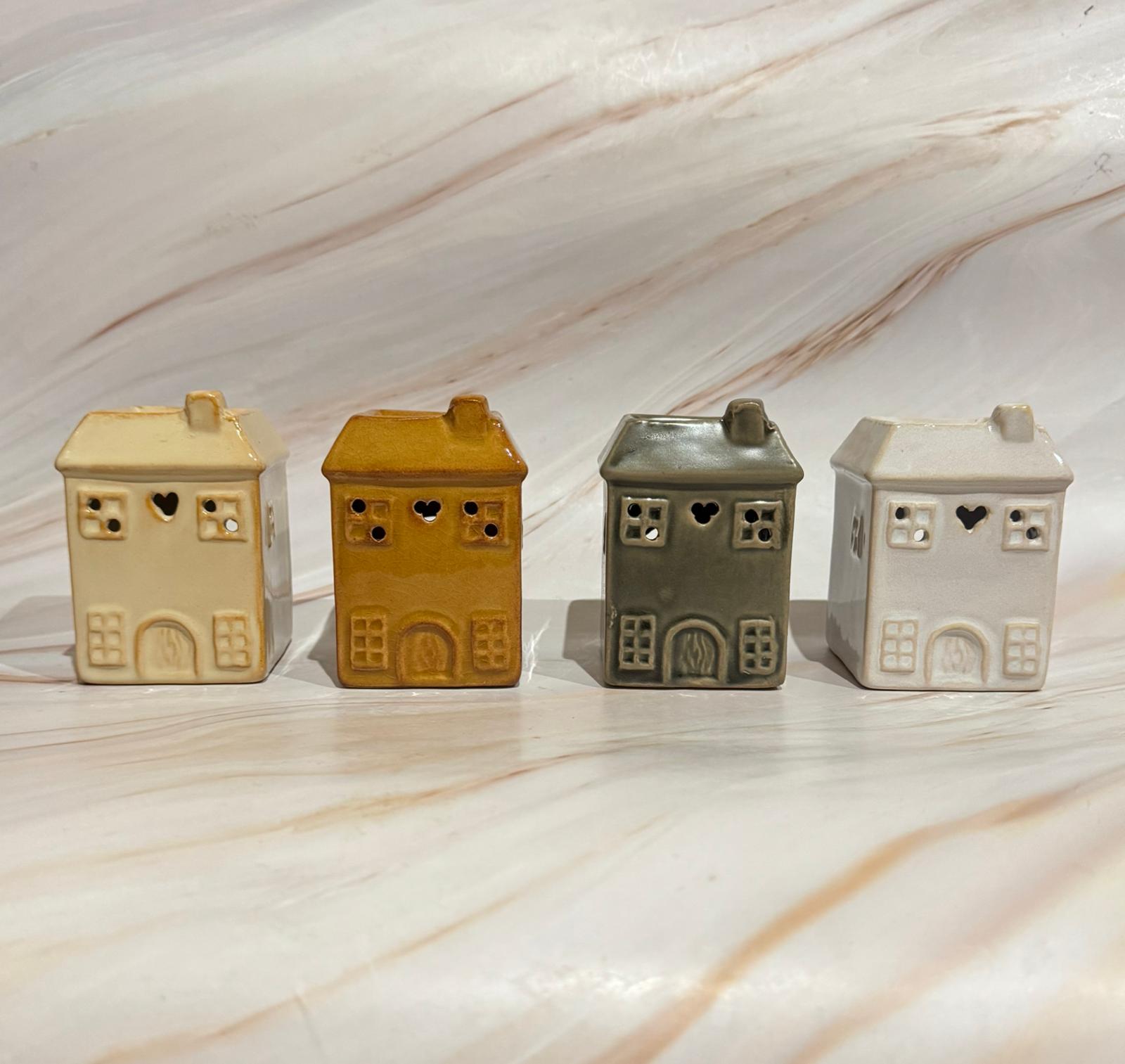 Nuestras casitas aromáticas están pensadas para esos pequeños rituales que llenan de calma el hogar. Fabricadas en cerámica esmaltada, cada una tiene un diseño encantador con ventanitas y una abertura en forma de corazón que deja ver la luz de la vela mientras se derrite tu wax melt favorito.